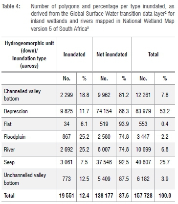 Seventeen Sustainable Development Goals (SDGs) were adopted in 2015 by member states of the United Nations and 2020 was the first year of reporting progress on the targets identified. In terms of aquatic ecosystems, SDG target 6.6 states: 'By 2020, protect and restore water-related ecosystems, including mountains, forests, wetlands, rivers, aquifers and lakes'. Global statistics derived from the Global Surface Water (GSW) products2 were released to assist each country in reporting sub-indicator SDG 6.6.1a, which pertains to the spatial extent of surface aquatic ecosystems. In 2019, South Africa released the latest National Biodiversity Assessment of 2018, which included updates to the National Wetland Map version 5 (NWM5) and artificial wetlands spatial data layers.3 These data sets provide a new opportunity for comparing the spatial extent of surface aquatic ecosystems between the different data sets. In addition, other GSW products are also considered for characterising the hydroperiod of South African wetlands.