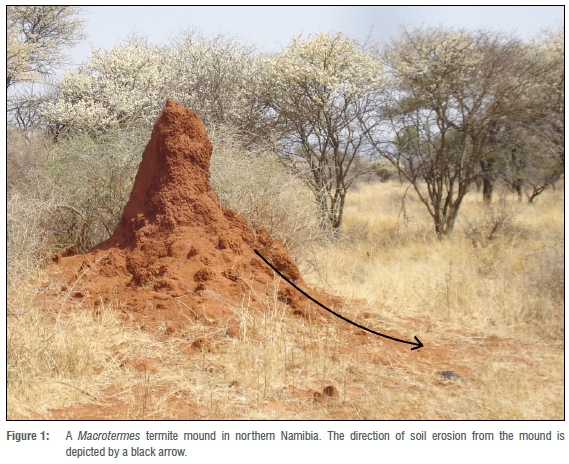 The mounds of Macrotermes termites in sandy soils usually have a greater clay content than surrounding topsoils.1 The origin of the clay used in the construction of the mounds has not been systematically investigated, but could be from the topsoil, subsoil or tens of metres into the regolith.2 There are a range of potentially positive ecological effects of this clay mining by the termites. Erosion of the mound material (Figure 1) will increase the clay content of topsoils and consequently their nutrient status, water-holding capacity and nutrient-holding capacity. There is, however, a potentially negative effect of increased clay content in sandy topsoils, namely an increased tendency of the surface layer of the soil to seal during rain events, and to reduce infiltration of rainwater as a result.