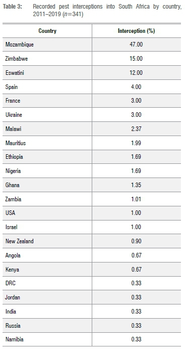 The highest frequency of pest interceptions occurred on commodities imported mainly from Mozambique (47%), followed by Zimbabwe (15%) and Eswatini (12%). The frequency of interceptions from Spain, France, Ukraine, Malawi, Ethiopia, Nigeria, Ghana, Mauritius, Zambia, USA and Israel was between 1% and 5%, while countries such as New Zealand, Angola, Kenya, DRC, Jordan, India, Russia and Namibia accounted for less than 1% (Table 3).