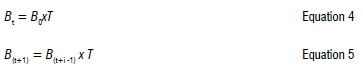 where B0 is the area under the crop in the base year; B(t+1) is the area under the crop in the next year (prediction); and T is the transitional probability matrix.