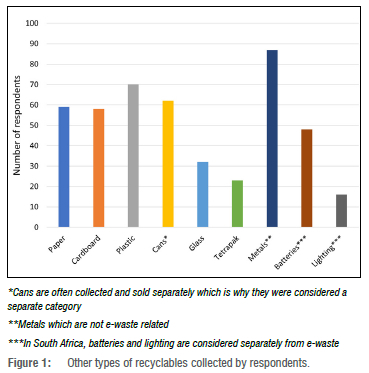 Respondents sourced e-waste from a variety of sources, including industrial areas, directly from shops/businesses, landfills and schools. The most popular sources were reportedly dustbins outside houses and directly from residents. Some respondents had built relationships with residents, who then kept items aside for them. It was reported in the focus group discussions that a few respondents had admitted to stealing items. Respondents collected a wide variety of items including screens, cables and household appliances. Copper, printed circuit boards and other metals were perceived to be the top three most valuable fractions. Most waste pickers do not primarily specialise on e-waste alone, which was also reflected in this study as 98 respondents indicated that they also collected other types of recyclables (Figure 1).