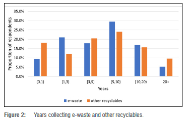 Of the respondents, 70.1% reportedly collected e-waste at least 5 days a week, with some working daily. They worked a mean(±standard deviation) of 9.1±2.8 hours a day. As shown in Figure 2, 48.4% of respondents had been collecting e-waste for less than 5 years, whilst 22.1% had at least 10 years' experience. For those also collecting other recyclables, 50.6% had less than 5 years of experience; 56.0% of respondents collecting both e-waste and other recyclables started collecting them at the same time, whilst 21.3% started by collecting e-waste before moving onto other recyclables.