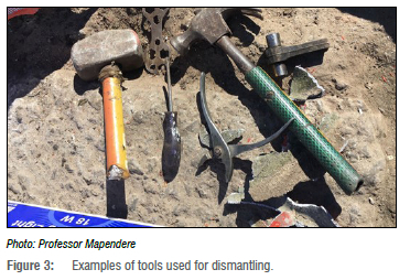 The results show that 82.7% of the interviewees indicated that they dismantled e-waste. Almost none of them reported any formal training, with only one receiving training on-the-job while working at a buy-back centre. The most commonly used tools for dismantling were hammers and screwdrivers (examples shown in Figure 3). Left-over materials deemed to have low economic value are commonly dumped in the area in which they are working. The majority indicated that they dismantled the goods at home (88.5%) whilst some dismantled at buy-back centres. The primary motivation reported for dismantling is that they can obtain higher prices for the different fractions of dismantled goods.