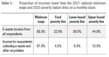 When considering the extent to which waste picking activities can contribute to livelihoods, in Cape Town, the likelihood of surviving on e-waste activities alone is low. In this study, of those participating in e-waste picking alone, 22.9% were below the food poverty line. In addition, 83.3% of them reported earnings below minimum wage. Those who collected a wide array of recyclables fared better, with only 4.2% under the food poverty line. When we go beyond the income and consider the health and safety risks of waste picking, the risk is not commensurate with the reward. Thus, in reality, e-waste picking can be considered a survivalist strategy - a finding which is supported by the results of a study conducted in Ghana.26 This finding is characteristic of informal self-employment, a category of informal employment where the focus is on survivalist strategies.21