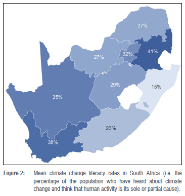 Climate change literacy includes being aware of both climate change and its anthropogenic causes. Together with climate services, it underpins informed mitigation and adaptation responses. South Africa is one of just five African countries in which fewer than half (41%) of its citizens have heard of climate change.22 South African provincial climate change literacy rates constitute some of the lowest sub-national rates on the continent, varying from as low as 15% in KwaZulu-Natal to 41% in Mpumalanga (Figure 2). Ranked at 29 out of 33 countries surveyed in Africa, South Africa's national rate is 28%.1,23 National rates on the continent range from only 23% to 66% of the population.