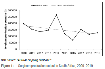 Sorghum in South Africa is produced on both commercial and smallholder farms, across six provinces, namely, the Free State, Limpopo, Mpumalanga, North West, Gauteng and KwaZulu-Natal.13 It is predominantly grown in the western region, possibly due to its increased tolerance for drier growing conditions.10 Sorghum production mainly occurs under dryland cultivation in South Africa, which accounts for up to 99% of the sorghum cultivated area.14 In the commercial sector sorghum production trends have been variable, with some notable decreases in the past decade and an average annual production output of 148 370 tonnes between 2010 and 2019 (Figure 1).9 Availability of production data on smallholder systems is limited13,15, which could possibly be due to lack of documentation and/or non-significant yield output from the sector. As such, efforts to characterise and quantify the contribution of smallholder production to national sorghum grain stocks are essential.