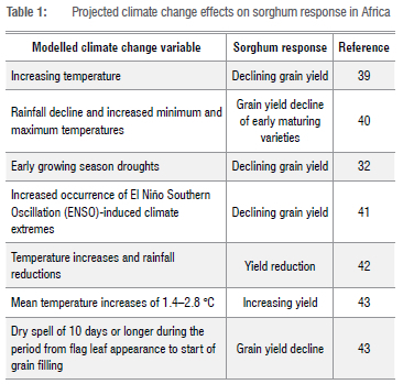 It is noteworthy that, although several studies have predicted likely changes in climate change variables such as temperature, rainfall, CO2 emissions and droughts in South Africa, there is a scarcity of modelling of sorghum crop responses, compared to other sub-Saharan African countries.31,32 In South Africa, only a handful of such studies were found. For example, Chimonyo and Mabhaudhi37 used a process-based crop model, APSIM (Agricultural Production Systems Simulator) to develop and make recommendations for improving the productivity of sorghum-cowpea intercrop systems under water-scarce conditions. In another study, Zinyengere et al.38 showed that DSSAT could be used for modelling maize and sorghum yields under data limited conditions. Clearly, there are limitations with regard to putting forward recommendations for agronomic practices, management and decision support for sorghum production so as optimise its productivity and benefits. Consequently, we used a few examples from other parts of Africa to highlight some projected effects of climate change on sorghum (Table 1).