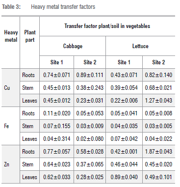 The concentrations in mg/kg were assessed in roots, stem and leaves, as presented in Table 2 for both cabbage and lettuce grown at two different sites irrigated with river water. The mean concentrations of heavy metals in vegetables appeared to have a wide range: 0.061-0.339 mg/kg for Cu, 1.650-10.24 mg/kg for Fe and 0.387-2.566 mg/kg for Zn. The highest levels of Cu, Fe and Zn were recorded in lettuce leaves, cabbage roots and lettuce roots, respectively, from Site 2 for all. The lowest levels of Cu, Fe, and Zn were all recorded in cabbage leaves from Site 2. It is understood that the differences and variations in concentrations could be attributed to the plant's abilities in terms of absorbing and accumulating heavy metals25, and differences in growth phase and rate of growth26.