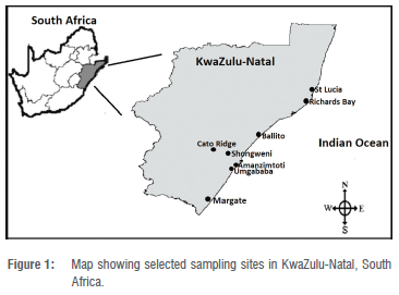 Collected plant material was placed in plastic bags, sealed, and stored. Plant specimens from each sampling site were submitted for authentication by the taxonomist, Mr Edward Khathi, in the School of Life Sciences (University of KwaZulu-Natal, South Africa), where a voucher specimen (Buthelezi C 01-18274) was deposited. The soil was collected from the eight sites at 10-15 cm below the plant's roots using a plastic spade. Plant samples were washed with double-distilled water, dried in the oven at 50 °C for 24 h, and then crushed using a pestle and mortar. Plant material from site 7 (Amanzimtoti) was used for phytochemical analysis due to the large quantity available at this site. Composite soil samples from each site were obtained by coning and quartering. Soil samples (10 g) were sieved through a 2 mm mesh sieve to get uniform particle size, air dried, and crushed using a mortar and pestle. All dried samples were stored in sealed plastic bags and kept in a refrigerator at 4 °C.