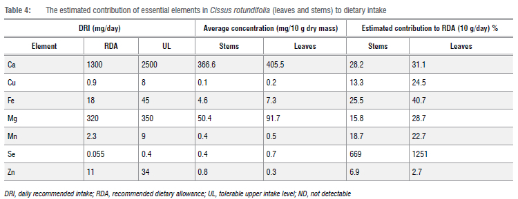 The elemental concentrations of the leaves and stems were compared to the dietary reference intakes (DRIs) for most individuals to estimate the contribution of the consumption of 10 g of C. rotundifolia leaves and stems (based on the dry mass) to the diet (Table 4). For the elements to be considered good contributors to the diet, their concentrations should not exceed the tolerable upper intake levels (ULs).33 Consumption of 10 g of leaves and stems would contribute 25.5% and 40.7% towards the RDA for Fe, respectively. Fe is an essential metal found in haemoglobin, and its deficiency in humans can lead to ailments such as anaemia, cancer, and heart disease.47 Local people consuming this plant (especially those diagnosed with anaemia) can supplement their Fe intake, similar to consuming fruits and vegetables such as apricots, olives, and beetroot.48