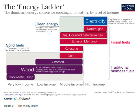 Very low-income households prefer wood and biomass (crop waste and dried dung) as a fuel for cooking, but sometimes also use coal and charcoal. This preference is attributed to a lack of access to the national electricity grid, affordability issues and easiness of use. Fossil fuels are usually burnt on open stoves which results in significant indoor air pollution and exposes household members to pollution and affects their health. According to the 'energy ladder' hypothesis, households evolve from solid fuels to cleaner forms of energy and particularly electricity.