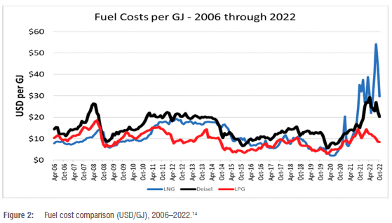 Clark et al.11 reviewed the relationship between diesel and LPG prices over the past 15 years. That analysis showed that the average LPG price was approximately 60% of the diesel price (on an energy basis). Since this analysis, significant movements in the energy market have occurred due to COVID, the European Energy Crisis and the war in Ukraine. The international energy prices for LNG, diesel and LPG (updated through 2022) are shown in Figure 2 (based on prices published by the US Energy Information Agency for prices at the US Gulf Coast export point).14 While LNG had a considerable increase in 2021 and 2022, diesel did not change nearly as much, whilst the LPG price hardly changed.