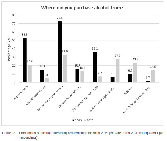 The purpose of our study was to explore and describe alcohol purchasing behaviours, and specifically alcohol purchasing changes between 2019 pre-COVID and 2020 during different periods of COVID-19 lockdown in South Africa, as well as to investigate possible drivers of illegal alcohol purchasing.