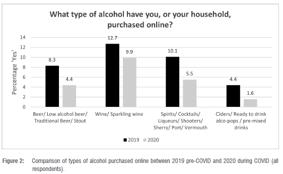 There was an overall reduction in online purchasing of all types of alcohol between 2019 and 2020 (Figure 2). The type of alcohol purchased most frequently online did not differ from 2019 to 2020, with wine and sparkling wine being the most frequently bought alcohol online. Spirits were the second most frequently type of alcohol bought online, with beer third and ciders/alco-pops coming in fourth place.
