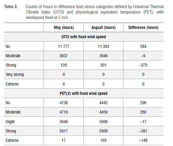 Table 2 shows the number of heat stress hours according to UTCI, PET(1) and PET(2). Using UTCI, there are more days in August than in May on which the maximum UTCI indicates 'strong' or 'very strong' heat stress. There are no days when the UTCI indicates 'extreme' heat stress. Using PET(1), there are more days in August than in May on which PET indicates 'strong' heat stress, and no days when the pEt indicates 'extreme' heat stress. Using PET(2), there are more days in May than in August on which the PET indicates 'strong' or 'extreme' heat stress. Therefore, UTCI and PET(1) indicate that May has lower heat stress, but PET(2) indicates that August has lower heat stress.