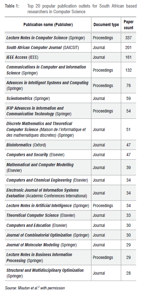 A scientometric assessment of Computer Science in South Africa by Mouton et al.2 for the period 2005-2020 concluded that LNCS is the predominant publication choice for local Computer Science researchers. They analysed 3441 papers in 472 publications retrieved from the SA (South African) Knowledgebase database of DHET subsidy-earning publications (see Supplement B and C21). The adapted data (Table 1)2 underscore the popularity of conference proceedings as a publication outlet for this discipline, with 6 of the top 20 publication outlets being conference proceedings and 14 being journals.