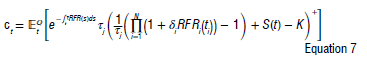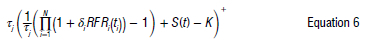 where RFRj(ti) for ; ε 1, ... ,N denotes the alternative overnight rates in the given reference period. In Equation 1, the variable tj signifies the cash day count fraction relevant to the accrued period, while δipertains to the cash day count fraction corresponding to the overnight accrued period. Importantly, this rate encapsulates the actual rate operative over the specified period, distinguishing itself by its reduced volatility when contrasted with an average rate. It derives its foundation from the well-established Overnight Index Swap market, leveraging the extant cross-hedging capabilities inherent within this market.