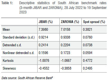 Anticipations regarding the alternative reference rate posit its character as a risk-free or near-risk-free benchmark, potentially devoid of term structure. In this context, ZARONIA (South African Overnight Index Average), derived from the repo market, has been embraced as the alternative reference rate of choice, symbolising a steadfast commitment to heightened transparency and accuracy within the South African financial landscape.[4] ZARONIA, renowned for its origins and reliability, emerges as a compelling candidate to supplant JIBAR, serving as a more representative indicator of short-term borrowing costs. Its robust attributes further accentuate its suitability for the role of JIBAR's successor.