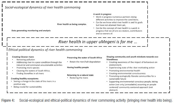 Table 1 shows the following dynamics of bringing river health into being. The view that river health is a process was prominent. This process was reflected as involving the monitoring practices, as well as engaging communities within a people-centred approach to river ccmmoning. The data also show that bringing river health into being requires healthy ecosystems and the need to move the river from one condition (bad) to another (more favourable) condition. Bringing river health into being also involves restorative practices, co-creating solutions, environmental consciousness / ecological literacy, and advancement of environmental health, healthy ecosystems, healthy people and healthy communities generally