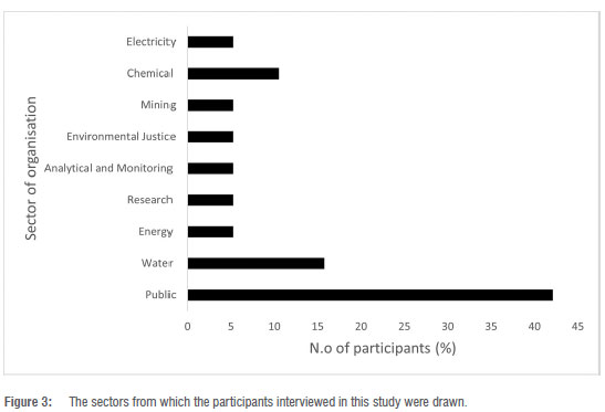A total of 19 respondents were interviewed for this study. Approximately 74% of the participants work in the public sector, 15% of the participants were in non-profit organisation (NPOs), and 11% in the private sector. Participants' interest in the water sector include water resource management (37%), integrated water quality management (11%), environmental policy implementation (5%), environmental toxicology (11%), environmental protection (16%), and activism/social justice/ advocacy/civil society (5%). The participants' level of education and qualifications were Bachelor of Science (15%), Honours degree (5%), Master of Science (57%), and Doctor of Philosophy (21%). The participants' specialisations included ecology, hydrogeology, hydrology, chemistry, and toxicology, as shown in Figures 2 and 3.