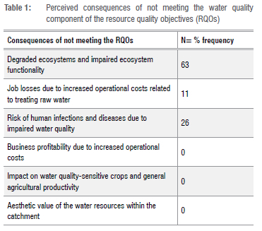 Participants were asked about the most iikeiy consequences of not meeting the gazetted water quality component of the RQOs. About 63% of the participants agreed that degraded ecosystems and impaired ecosystem functionality would be a serious consequence (Table 1). Twenty-six percent of the participants perceived the risk of human infections and diseases due to impaired water quality as a serious consequence of not meeting the RQOs. About 11% of the participants considered job losses due to increased operational costs related to treating raw water for industrial uses.