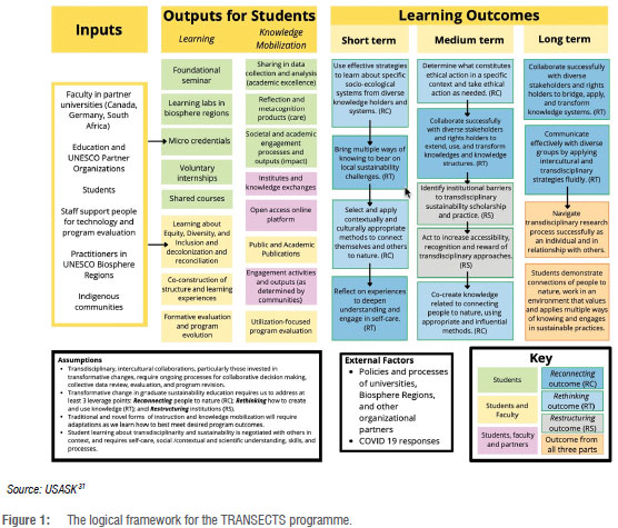 The team conceptualising TRANSECTS (which includes the authors) produced an evaluation framework to track, reflect and report on all programme processes, outcomes and impacts over its envisaged 6-year lifespan.6 As TRANSECTS is about exploring innovation and transformations in sustainability education, we aimed to design an evaluation framework that aligned with the transformative intent of the programme and to optimise ongoing learning, as explained below.