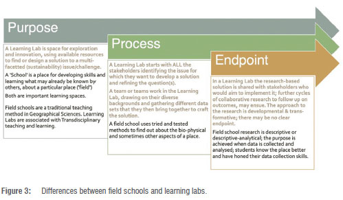 Drawing on the literature on Learning Labs and Challenge Labs22,35,36 and our experience as higher education practitioners in the Geographical and Sustainability Sciences, Higher Education Scholarship of Teaching and Learning, and Environmental Education, of Field Schools (the term used in Canada) or field trips (the term used in South Africa), we identified key differences related to purpose, process and end-points (Figure 3).
