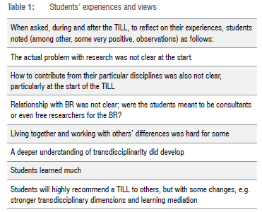 Why, despite significant efforts by all parties, did we conclude that the curriculum design was not as innovative or transformative as we had sought? On reflection, we realised that our approach to the TILL was predominantly resource-based (asking what resources we have and how best to use them) with less attention to designing curriculum to achieve learning outcomes. We also noted that while students and mentors had been briefed about the ways in which the TILL was to be transdisciplinary, this phrase had different meanings and applications. We did not clarify what forms of transdisciplinarity we were seeking to promote. Ironically, we did not consider just what it requires for us as the institutional partners to collaborate as a multidisciplinary team spread across three continents. Online meetings were not ideal for developing a shared conceptualisation of the TILL. Even team members who regularly interact with each other and had, on the surface, shared understandings of the nature of the innovation, also approached it quite differently. Disciplinary differences might have had a role in this, and thus, it is an instructive example of the situations that transdisciplinary practitioners (including our graduates) find themselves in, in the complex social-ecological landscapes of practice. We can only conclude, retroductively32, that transcending years of excellent disciplinary training were not going to happen in a single event - unless one applies these ideas in practice, and reflects on them, as we attempt to do here, on an ongoing basis.