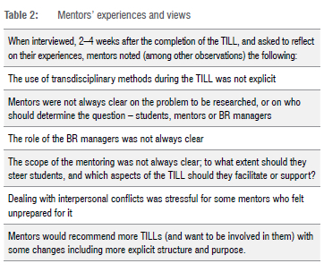 Despite concerted efforts to involve them, some mentors were not able to attend all the orientation sessions, and the BR managers found it particularly difficult to attend, possibly due to connectivity and work load. Another key development was that COVID struck during the first week of the TILL, leading to two mentors leaving the site of the Learning Lab early and offering to continue to mentor online; some other mentors and students experienced this as a notable gap in support.