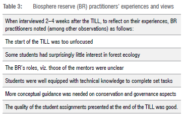 At this point, it should be noted that the TILL supported key learning outcomes and had many positive features and outcomes for students, mentors and community partners. For example, the students' final assignments were of good quality and well received by academics and BR practitioners alike; several students asked to attend the next TILLs as mentors; mentors offered to participate in future TILLs; and new relationships between BRs and universities were forged as a result of the shared endeavour. Given such successes, it would in fact have been easy for us to overlook the fact that the curriculum offering was in some ways simply a more ambitious version of what we would have offered in the past (a Field School) rather than the fundamentally different intervention (a transdisciplinary Learning Lab) we had theorised it to be.