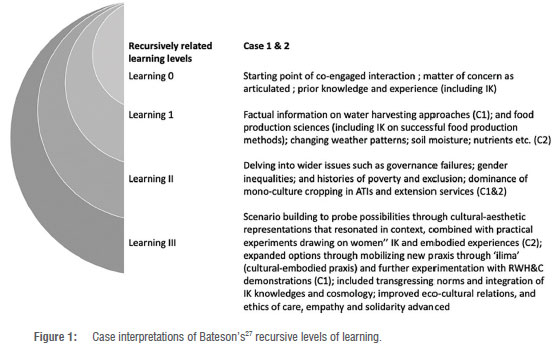 Interesting too, Bateson does not reduce Learning III to rational deliberation or discussion, but he includes the role of the unconscious and aesthetic, "saying that learning entails a double involvement of primary process and conscious thought"38 accommodating not only 'hard facts' but references to emotions, aesthetics, spirituality the sacred and "transconceptual experience"38(p.61), for example, the unlearning of colonial 'affects' as argued by Bozalek and Zembleya's12, or Fanon's 'living learning'9, as was the case for women in Case 2, and also in Case 1, if less explicitly Tosey and Mathison39 propose a development of Bateson's original framework with emphasis on "multiple modes of learning" (i.e. embodied, analytic and aesthetic) identified in Bateson's writing, which we see arising the two cases above where the embodied significance of demonstration sites (the kinds of 'living learning' referred to by Fanon's work9) in Cases 1 and 2, and the use of arts-based methods for co-producing alternative views and possibilities in Case 2, led to planting practices with rural women that helped them to challenge patriarchal and oppressive relations, and affirm their indigenous knowledge, leading to significant food system benefits. This leads us to consider what has not yet been considered adequately in the learning sciences, namely aspects of aesthetics, cosmology and arts in the opening up of possibilities for expanded third loop learning interpretations as articulated by Tosey and Mathison39 and thus also decoloniality of learning processes.40 We also note that our cases reflect a recursive relationality between first, second and third loop learning premises, as outlined in Figure 1 (i.e. the processes were not separate but iteratively related), a relation that Bateson27 also alerts us to in his original work. What is interesting is that Bateson noted that Level III learning is extremely difficult for individuals in constrained psychological learning experimental conditions, but our cases, along with other related research, shows that this seems to be less so in place-based transgressive learning collectives32,33