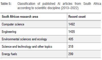 Table 5 highlights the scientific disciplines that have been prioritised in the field of AI in South Africa. The first two fields are nearly identical to those on the worldwide list (Table 1). It should be noted that the field 'Energy fuels' appears in the fifth position in South Africa, while internationally the position is occupied by the field of 'Telecommunications'. Similarly, 'Environmental sciences and ecology' occupies the third position in South Africa, while in the international list the position is occupied by the field of 'Mathematics'.