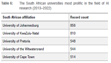 Table 6 shows the main producers of AI-related publications in South Africa. The University of Johannesburg is at the top of the list with 856 publications, followed by the University of KwaZulu-Natal with almost the same number of publications. It is noticeable that the annual number of publications by the various universities is relatively small, with the top universities in the field in the world (e.g. Harvard) producing twice as many publications as all the South African universities together. It can be argued that this is the result of the pluralistic management approach used in the national system of innovation.