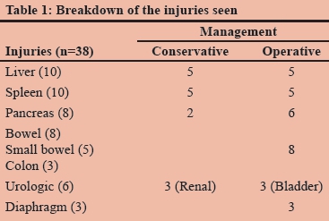 Intra-abdominal injuries were identified in 38 patients on imaging and/or at laparotomy. These injuries included ten liver injuries, ten splenic injuries, eight pancreatic injuries, five small and three large bowel injuries, three renal and three bladder injuries, and three diaphragm ruptures. In five patients laparotomy did not reveal any injuries. Table 1 summarises the operative and imaging findings of this cohort. The remaining 38 patients were admitted for serial abdominal observation.