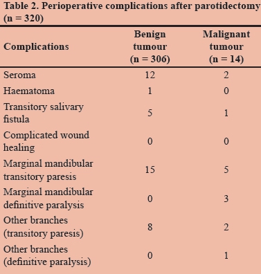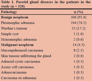 Three hundred and twenty patients who were diagnosed with parotid gland neoplasms were analysed retrospectively. The vast majority of patients (306) had benign neoplasms, and 14 patients had malignant neoplasms (Table 1). Overall, pleomorphic adenoma contributed to 76% of the lesions and Warthin's tumour to 17%.
