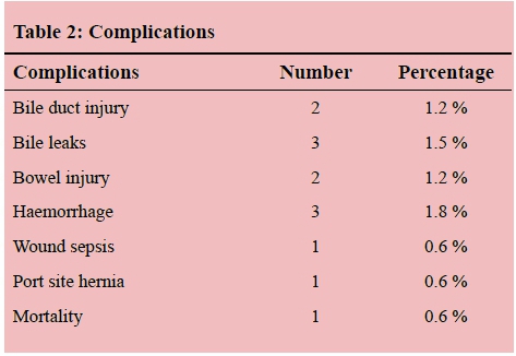 RESULTS: One hundred and sixty seven patients were evaluated. The median age was 43 years with range (17-78) years and 93% were female and 7% male. There were 44%, 23%, 20% and 13% who presented with biliary colic, acute pancreatitis, acute cholecystitis and obstructive jaundice respectively. Nine (5.4%) patients required conversion to an open cholecystectomy. Complications occurred in 16.2% and bile duct injuries and bile leaks in 1.2% and 1.8% respectively. One patient died.