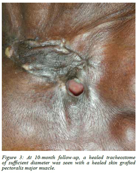 Our initial surgical objective was to use a free flap to provide an on-lay second layer closure for an oesophageal repair performed via the tracheostome. Free flaps do provide vital thin pliable options, because bulk can result in obstruction to the oesophagus, tracheostome or both. However, in this series free flaps failed. This forced us to question their use as the flap of first choice, or as a salvage option for prior failed free flap. By default, PMMF was then used to salvage the reconstruction after 3 free flap failures in the first 2 cases and in the last case the PMMF was used as a primary option of reconstruction.