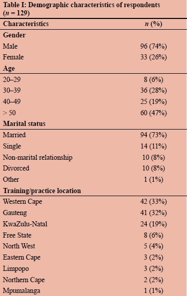 One hundred and twenty-nine participants responded to the survey, 33 (26%) of whom were female and 60 (47%) were over the age of 50 years (Table I). The majority of respondents (84%) were from the Western Cape, Gauteng, and KwaZulu-Natal. Specialist surgeons accounted for 71% of the responses (n = 87) and the median number of years in practice was 18 (IQR 10-28) (Table II). Most respondents were in full-time public practice (n = 53; 43%). The desire to pursue a surgical career was informed by a variety of reasons: technical aspect of surgery (n = 69; 53%), acute element of surgery (n = 66; 51%), inspired by a role model (n = 49; 38%), academic competitiveness (n = 18; 14%), prestige of surgery (n = 8; 6%), or family pressure (n = 2; 2%).