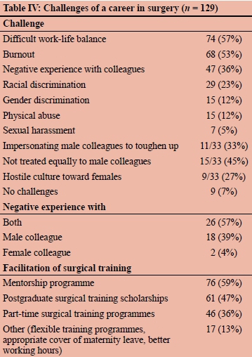 Unique challenges of a surgical career related to a lack of a work-life balance (57%), with 53% of participants reporting burnout. Specialist surgeons were more likely to experience burnout than any other position, although not statistically significant (p = 0.06). Other challenges related to a hostile work environment, including negative experiences with colleagues and discrimination and abuse of varying forms (Table IV). More participants reported negative experiences with male colleagues than with female colleagues (p = 0.02). In addition to challenges, candidates also suggested aspects that would facilitate surgical training, including formalised mentorship programmes (49%), scholarships or funding to pursue postgraduate surgical training (47%), and more flexible work schedules (36%) (Table IV).