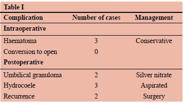 The complications experienced were classified as intraoperative and postoperative (Table I). During the operation, we experienced three haematomas, two as a result of injury to the inferior epigastric vessels and one of the testicular vessels. All were managed conservatively with no further issues. Postoperative complications included two umbilical granulomas that occurred in patients, one patient represented with umbilical pain that was later attributed to constipation, and he recovered after a fleet enema. Hydrocoeles were found in three patients a month after PIRS of whom one had a re-laparoscopy, and the PPV was confirmed to be closed. The three hydrocoeles were aspirated to dryness, and none has recurred after a minimum of eight months. We had two recurrent hernias; one had the repair done with Polydioxanone 3.0 and presented three months after the PIRS. This patient had a redo PIRS, and the processus vaginalis was patent with no suture identified. The second patient had the PIRS done with Prolene 3.0 and presented five months post PIRS with an irreducible obstructed hernia of the same side. He had a laparoscopic approach initially but as the bowel was too oedematous to reduce safely, it was converted to an open reduction and herniotomy. The Prolene suture was not identified at the re-operation, and the patient had recovered with no further recurrence to date.