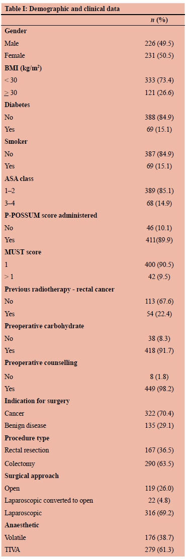 Between April 2015 and November 2019, a total of 481 patients were eligible for enrolment into the ERAS programme. One patient declined. Of the remaining 480 patients, 457 had colorectal and 23 had small bowel surgical procedures. In this study, we report on the 457 patients who had elective colorectal surgical procedures. Of these patients, 290 had a colonic resection and 167 a rectal resection. The median age was 65 years (IQR 56-73 years), with 25% of patients 73 years and older. The key demographic and clinical data are summarised in Table I.