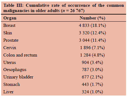 Malignant tumours of the breast were recorded in 18.1% (4 833/26 767) of the records from older adults, as compared to 12.4% (3 320/26 767) for skin, 11.4% (3 044/26 767) for prostate, 7.1% (1 896/26 767) for cervix and 4.8% (1 284/26 767) of colorectal cancers. Breast and colorectal tumours combined constituted 22.9% of newly diagnosed cancers in older adults (Table III).