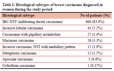 Seven hundred and eighty-seven women had a histologic diagnosis of invasive breast carcinoma (IBC). Of these carcinomas, 660 were IBC-NST (83.9%). ILC was the second most common diagnosis, seen in 41 women (5.2%). Of these patients with ILC, 12 did not have definitive surgery (diagnosis was made on core needle biopsy only) and 29 had definitive surgery. Fourteen of these surgical patients had a diagnosis of ILC on first core biopsy, and four on the second. Eleven had no core biopsy, and were initially diagnosed on fine needle aspiration cytology. Frequencies of other carcinoma subtypes are summarised in Table I.