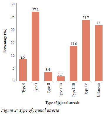 Thirty-three of the 92 patients were diagnosed with duodenal atresia. Specific type was not documented in the patient files. Jejunal atresia types were recorded according to the Grosfeld classification9 (Figure 2).