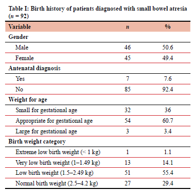 METHODS: A retrospective descriptive and analytical study was done on all neonates admitted with small bowel atresia from 1 January 2010 to 31 October 2016. Birth demographics, status on arrival, atresia type, surgical interventions and clinical course were analysed in relation to outcomes including mortality