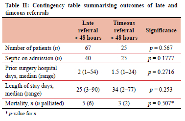 Although 40 of the septic patients were late referrals, there was no significant association between late referrals and sepsis on admission (p = 0.18). The patients' age at arrival had no statistically significant effect on mortality (p = 0.57). If the patients were referred late, their age at surgery was older (p < 0.0001). The patients stayed in hospital for a median of 28 days (range 2-90 days). However, the age at surgery had no significant effect on length of stay (p = 0.14). In the group that was referred late, patients were operated on a median of 2 days after admission (range 1-54 days). There was no statistical association between being referred late and length of time admitted prior to surgery (p = 0.27) (Table II).