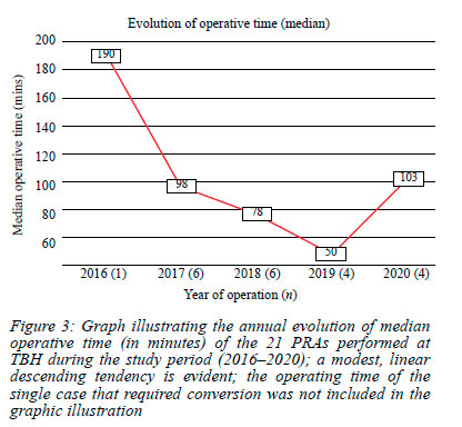 We report on the first 22 PRAs performed by two surgeons at TBH. The aims were to elucidate this approach's applicability, outcomes and safety, and reflect on the learning curve in terms of operative time.