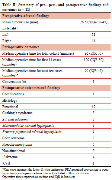 A retrospective review of 22 consecutive PRAs performed in a single centre between 1 September 2016 and 30 October 2020 is presented. TBH is an academic hospital in the Western Cape of South Africa and serves as a tertiary referral hospital. Two surgeons, WC and AL, experienced in laparoscopic operations, perform all adrenal surgery.