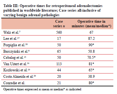 Significant variation in operative time amongst the 21 patients who had complete PRAs was encountered in our study. The median operative time was 80 minutes. The median operative time for the first half of the cohort was 120 minutes which was reduced to 70 minutes for the latter half, indicative of a modest learning curve. Operative times documented in the literature vary and are expressed as either mean or median operative times. Our median times are comparable to many reported case series (Table III).7,8,15-20 In the 560 cases initially reported by Walz et al. in 2006, the mean operating time was 67 minutes. This declined significantly from the earlier procedures (106 minutes for the first 112 operations) to the more recently performed (40 minutes for the last 112 cases). The authors noted longer operating times in male patients with pheochromocytomas, right-sided tumours and in tumours exceeding 3 cm.7 A learning curve with reduced operative times is reported in most of the mentioned case series of PRAs.