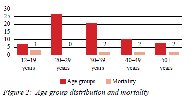 The average time from ingestion to presentation to Grey's Hospital was between nine to 72 hours. Twenty-one per cent (14) of patients required resuscitation on arrival. Seven had respiratory compromise with three requiring endotracheal intubation, four patients had a metabolic acidosis and two had an acute kidney injury. Four patients were hypotensive on presentation, but responsive to resuscitative efforts and three patients arrived in septic shock.
